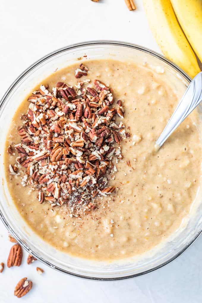 - Add in the dry ingredients to the wet: Combine and fold in the pecans.